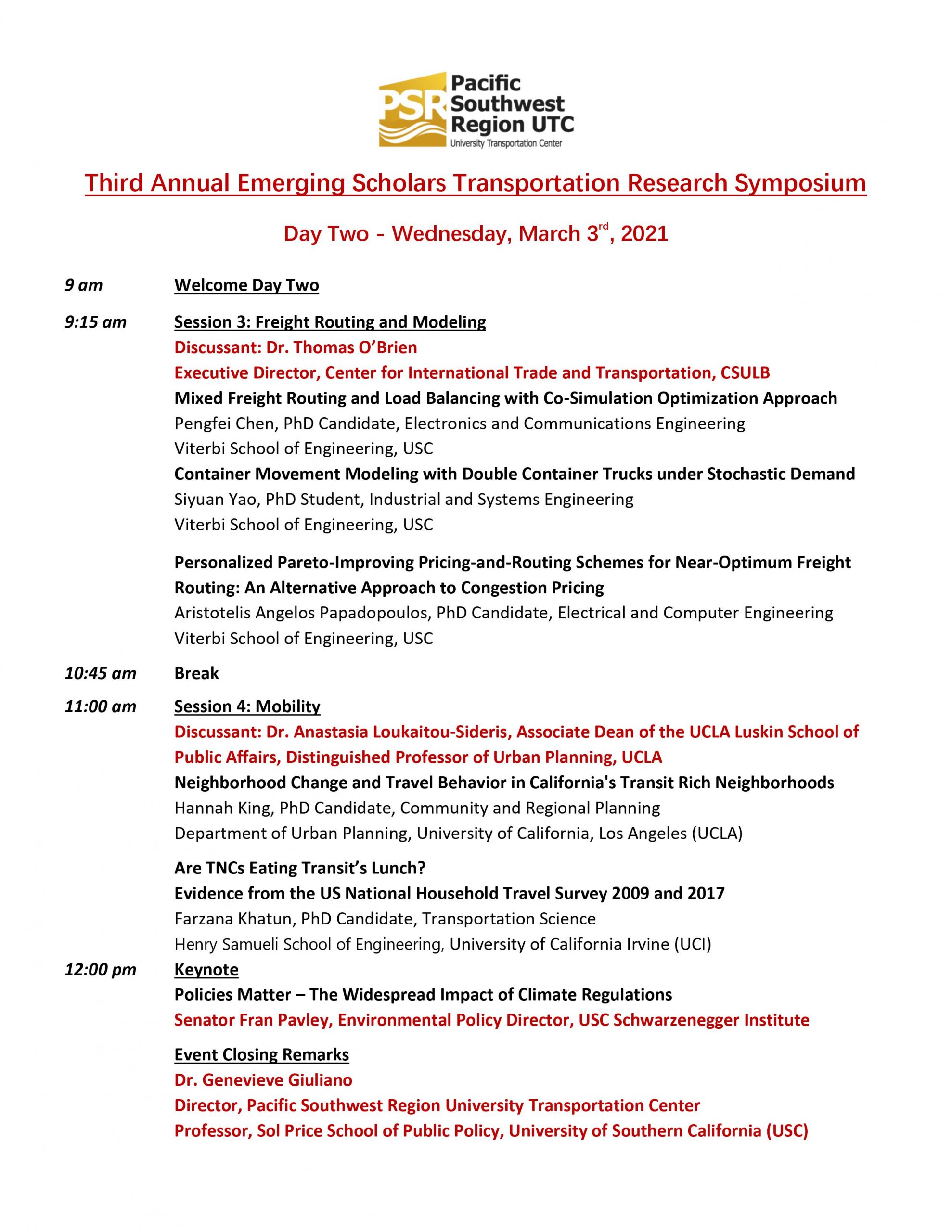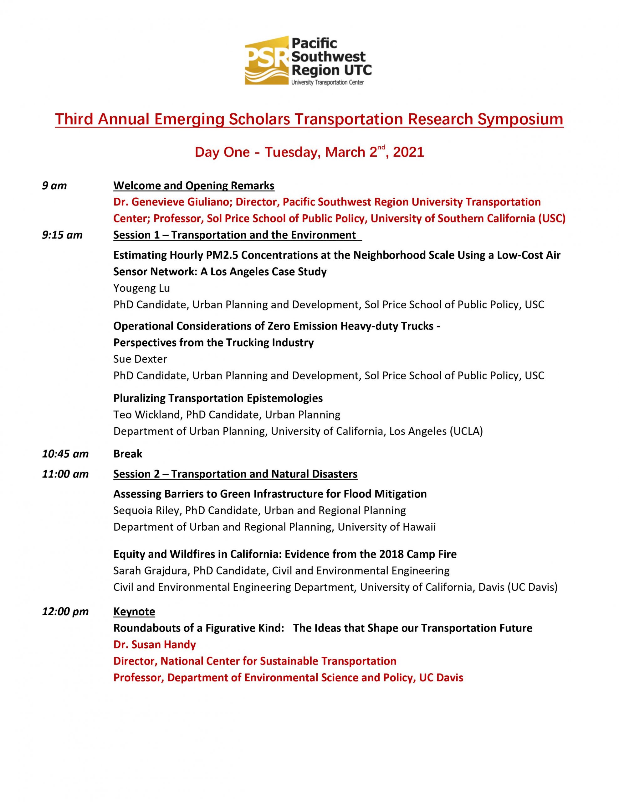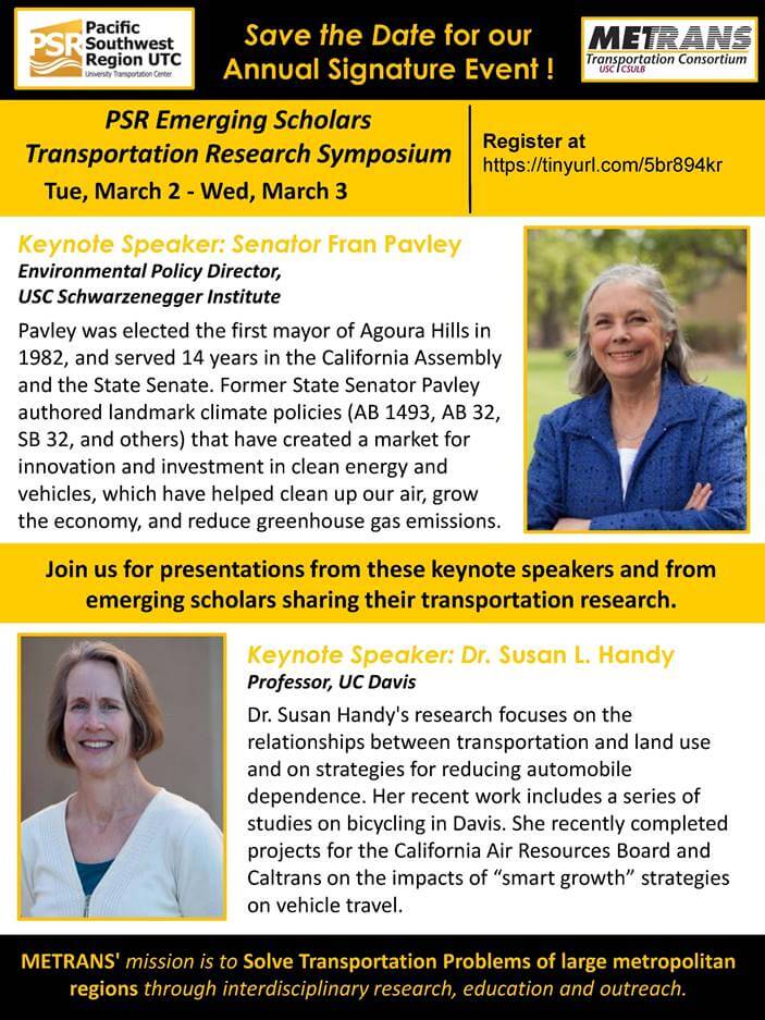 The Third Annual Emerging Scholars Transportation Research Symposium, hosted by the Pacific Southwest Region University Transportation Center, will be taking place on March 2nd and 3rd online. This webinar will feature presentations by PSR students and researchers on their work. UCLA PhD candidates Hannah King and Teo Wickland will be presenting on their research as well as UCLA professor Dr. Anastasia Loukaitou-Sideris. The event includes keynote presentations from Senator Fran Pavley and Dr. Susan Handy. See below for more details.