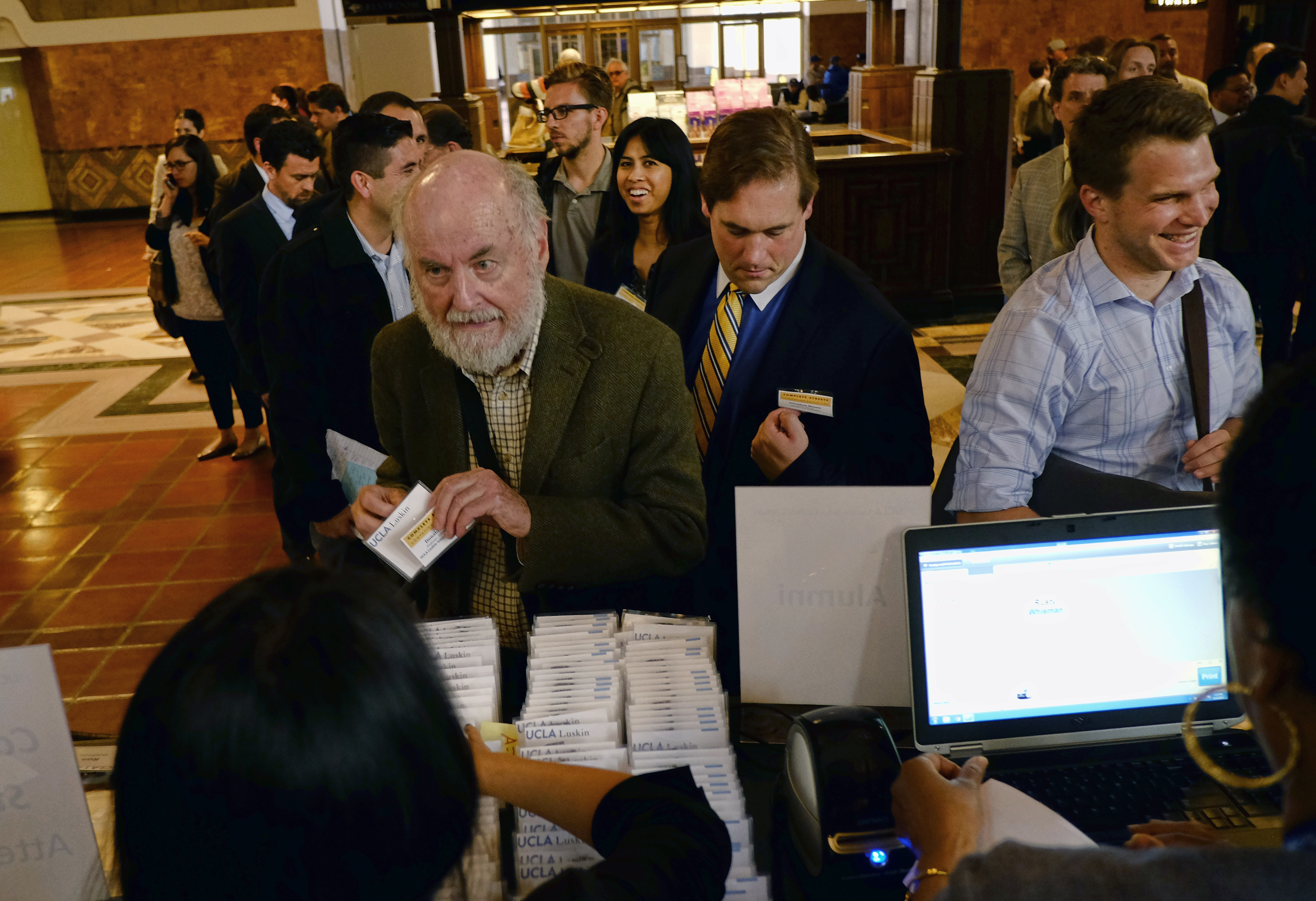 - Professor Donald Shoup gets his nametag and enters the lecture