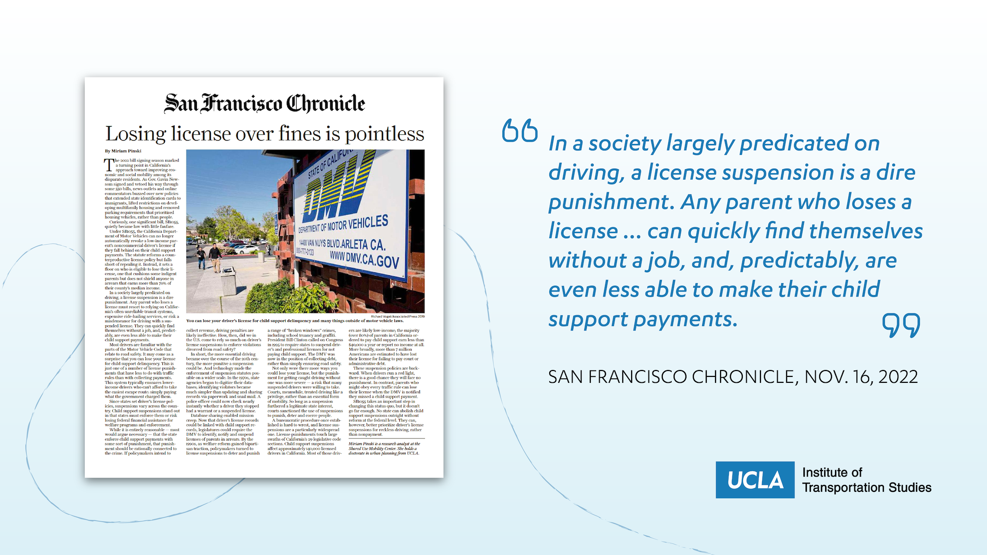 “Any parent who loses a license must resort to relying on California’s often unreliable transit systems, expensive ride-hailing services, or risk a misdemeanor for driving with a suspended license,” Pinski wrote. “They can quickly find themselves without a job, and, predictably, are even less able to make their child support payments.”