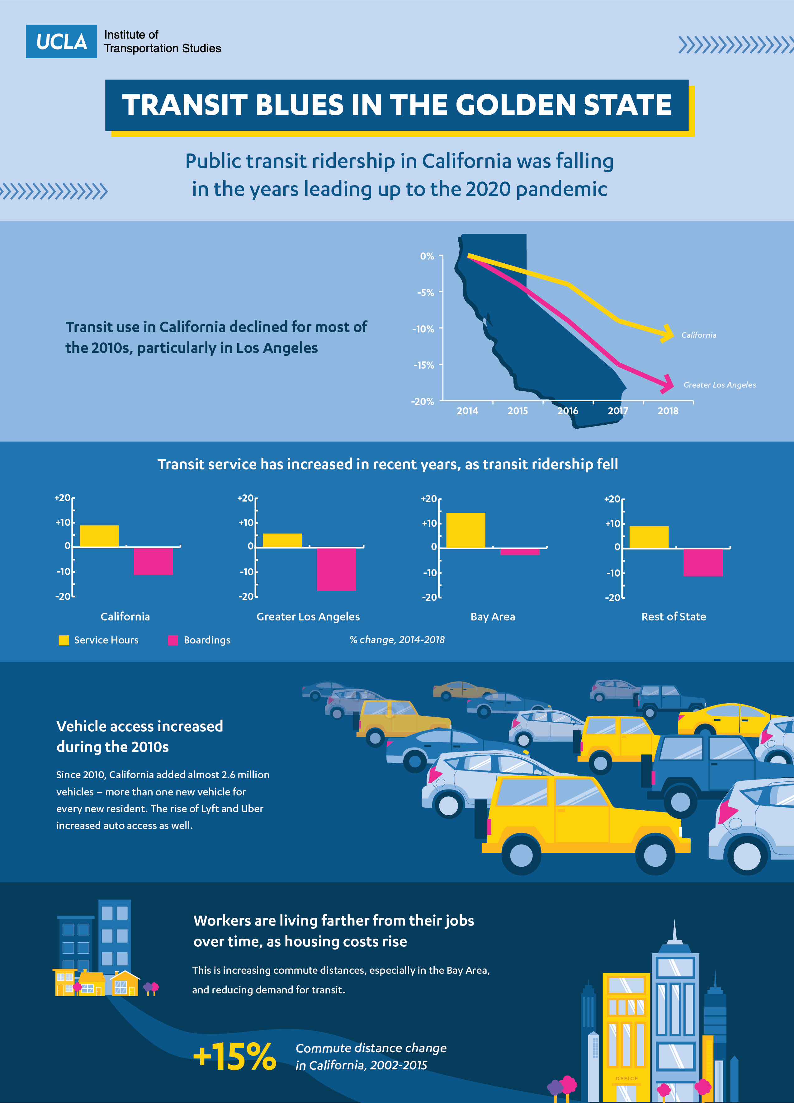 Transit patronage plunged staggeringly, from 50% to as much as 94%, during the first half of 2020 amidst the worst global pandemic in a century. But transit’s troubles in California date much earlier. From 2014 to 2018, California lost more than 165 million annual boardings, a drop of over 11%. This report examines public transit in California in the 2010s and the factors behind its falling ridership.