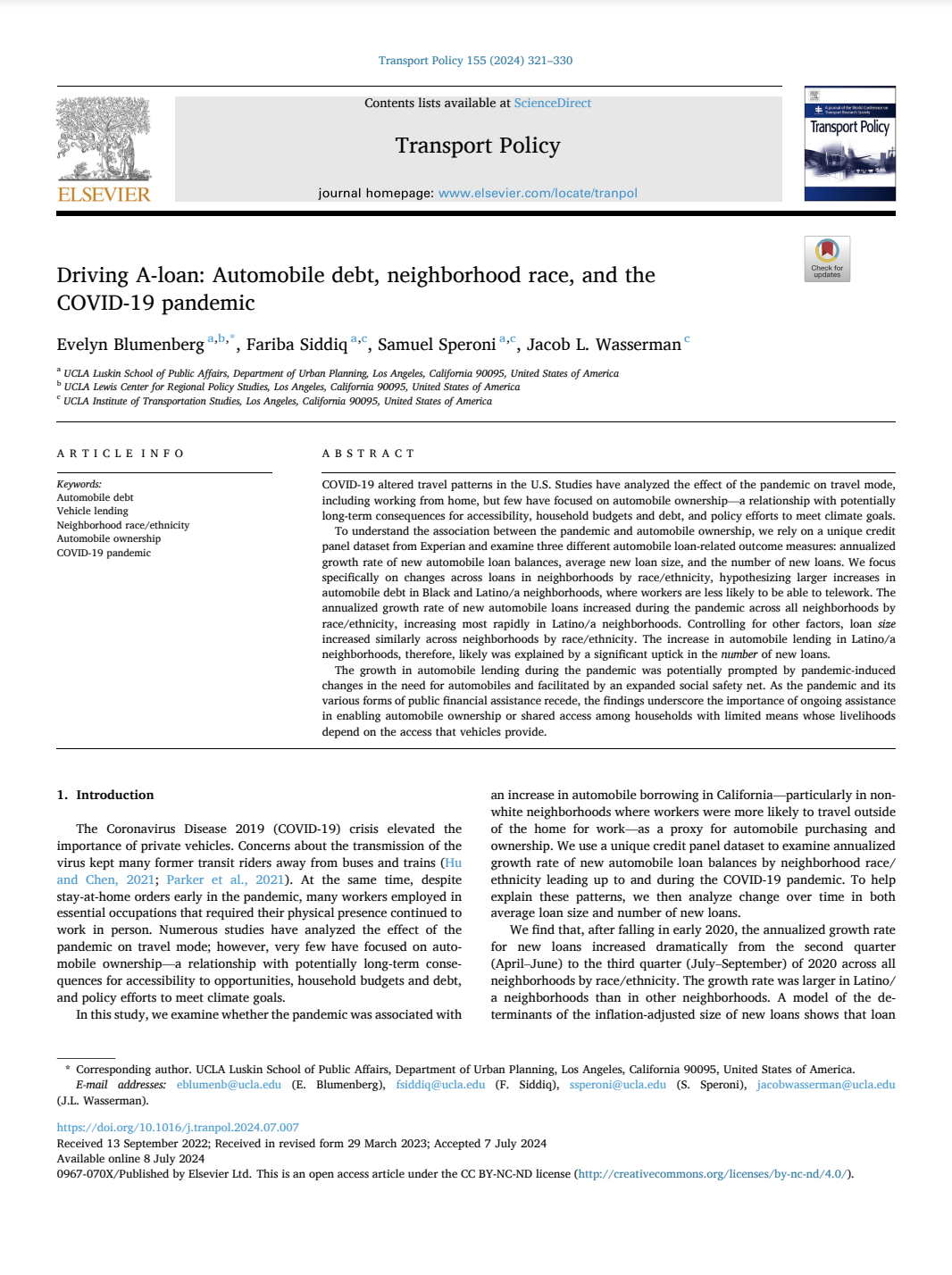 This project relies on data from the University of California Consumer Credit Panel from Experian to explore two sets of outcomes. First, to understand the association between the pandemic and automobile ownership, this project examines three different automobile loan-related outcome measures: annualized growth rate of new automobile loan balances, average new loan size, and the number of new loans. The project focuses specifically on changes across loans in neighborhoods by race/ethnicity, hypothesizing larger increases in automobile debt in Black and Latino/a neighborhoods, where workers are less likely to be able to telework. The annualized growth rate of new automobile loans increased during the pandemic across all neighborhoods by race/ethnicity, increasing most rapidly in Latino/a neighborhoods. Controlling for other factors, loan size increased similarly across neighborhoods by race/ethnicity. The increase in automobile lending in Latino/a neighborhoods, therefore, likely was explained by a significant uptick in the number of new loans.