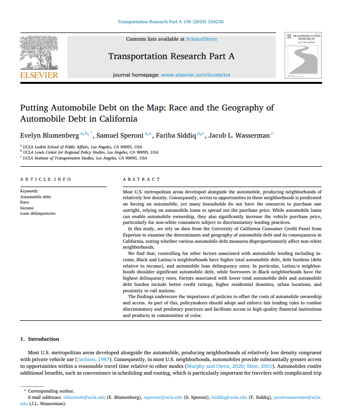Second, the project explores the determinants and geography of automobile debt and its consequences in California, testing whether various automobile debt measures disproportionately affect non-white neighborhoods. The research finds that, controlling for other factors associated with automobile lending including income, Black and Latino/a neighborhoods have higher total automobile debt, debt burdens (debt relative to income), and automobile loan delinquency rates. In particular, Latino/a neighborhoods shoulder significant automobile debt, while borrowers in Black neighborhoods have the highest delinquency rates. Factors associated with lower total automobile debt and automobile debt burden include better credit ratings, higher residential densities, urban locations, and proximity to rail stations.