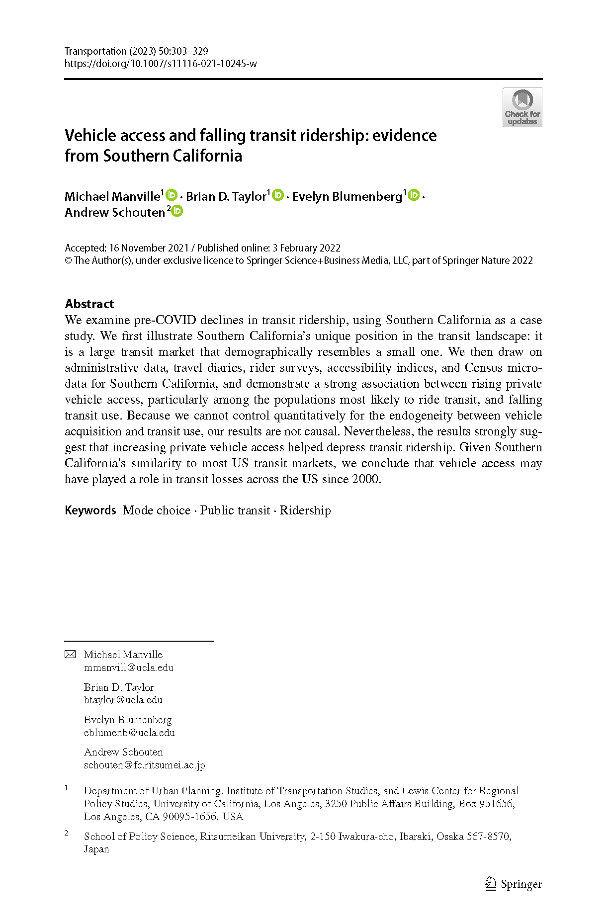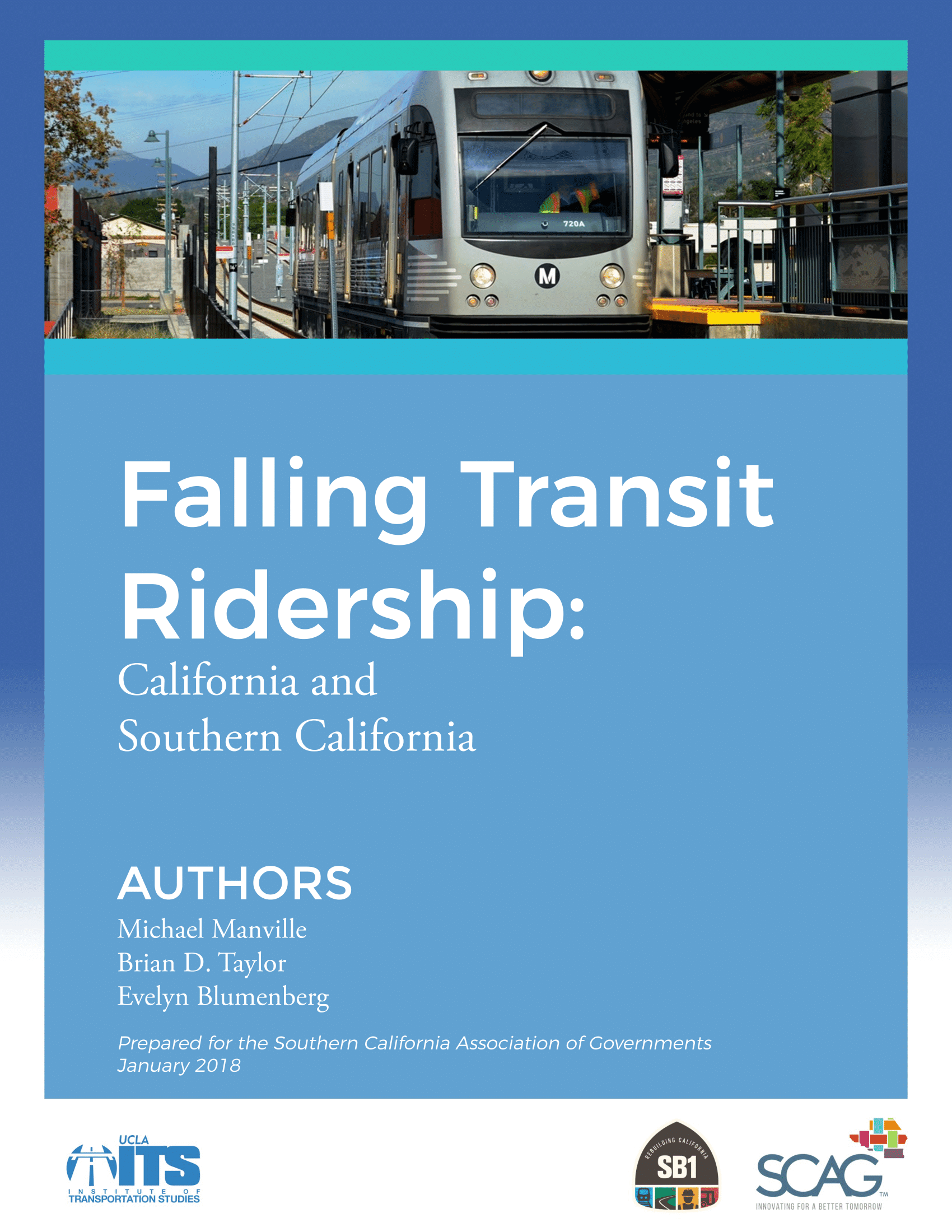 In the last ten years transit use in Southern California has fallen significantly. This report investigates that falling transit use. The project examines patterns of transit service and patronage over time and across the region and considers an array of explanations for falling transit use: declining transit service levels, eroding transit service quality, rising fares, falling fuel prices, the growth of Lyft and Uber, the migration of frequent transit users to outlying neighborhoods with less transit service, and rising vehicle ownership. While all of these factors probably play some role, the research concludes that the most significant factor is increased motor vehicle access, particularly among low-income households that have traditionally supplied the region with its most frequent and reliable transit users.