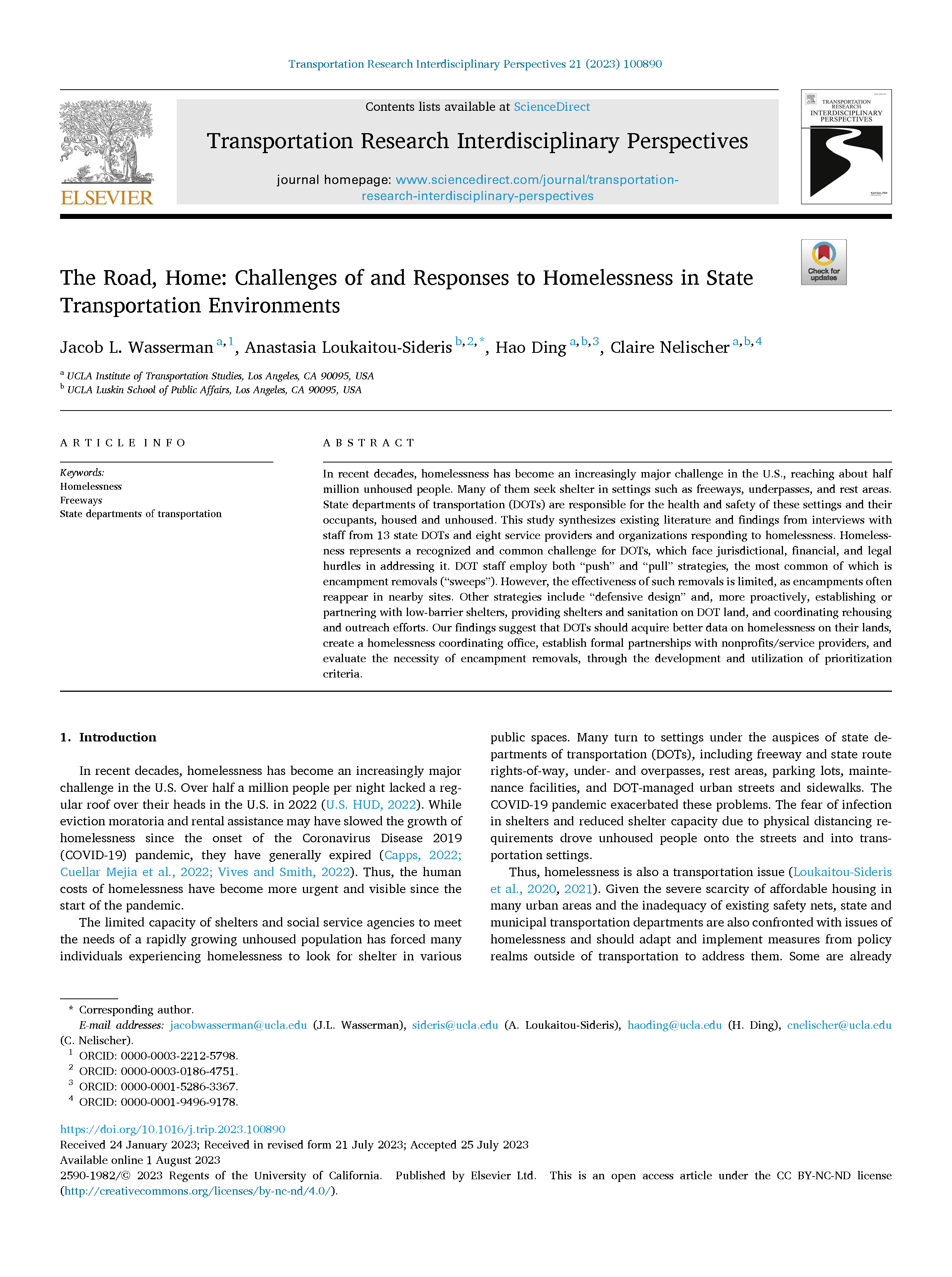 In recent decades, homelessness has become an increasingly major challenge in the U.S. Of the half million unhoused people in the U.S., many seek shelter in settings under the auspices of state departments of transportation (DOTs), such as freeways, underpasses, and rest areas. DOTs are responsible for the health and safety of these settings and of their occupants, housed and unhoused.