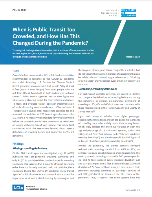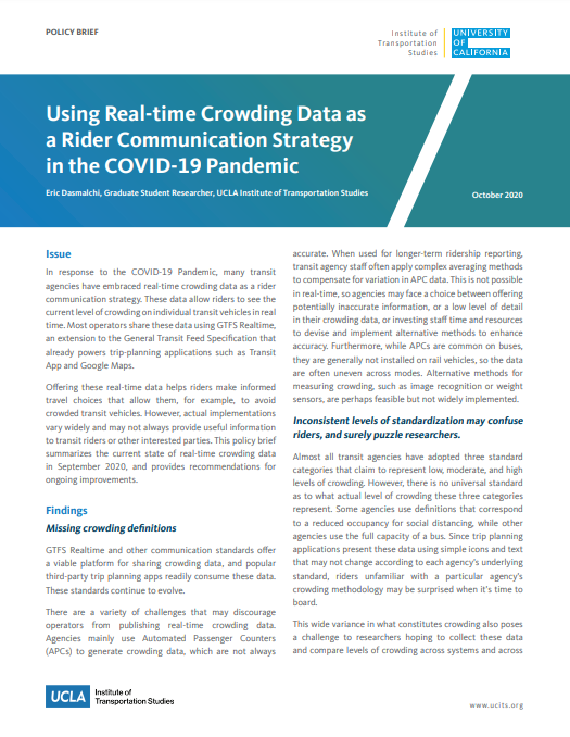 To understand how public transit is evolving in the pandemic, UCLA Institute of Transportation Studies researchers have looked into what transit service is changing, how it is changing, why it is changing, and for whom it is changing. The project has also examined how well the changes made affect the spread of COVID-19, and how transit can continue to safely serve the mobility needs of essential workers during the pandemic.