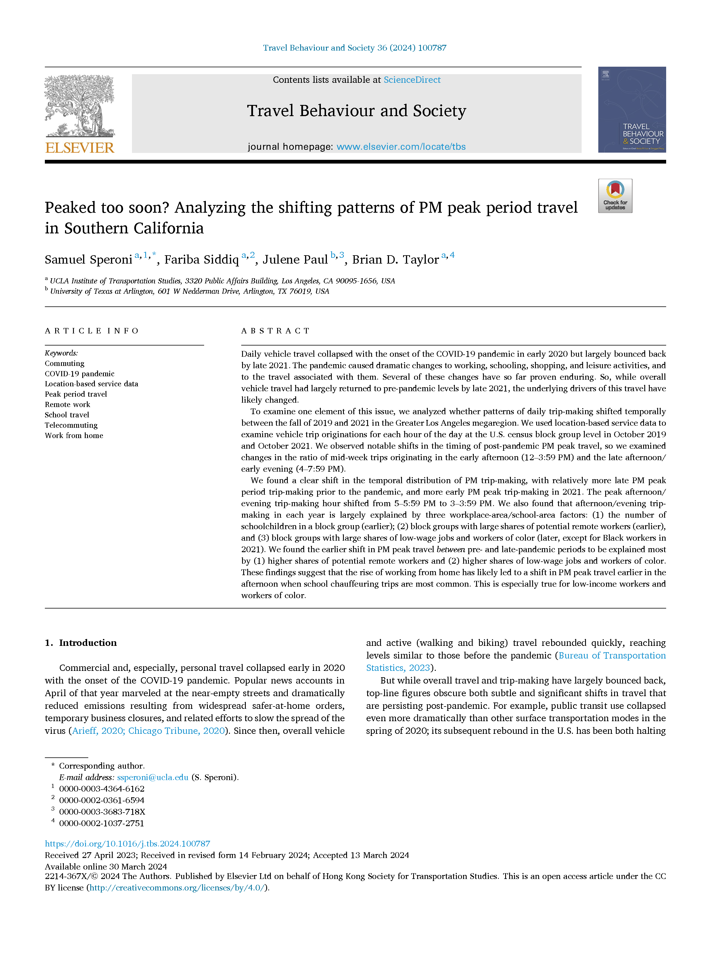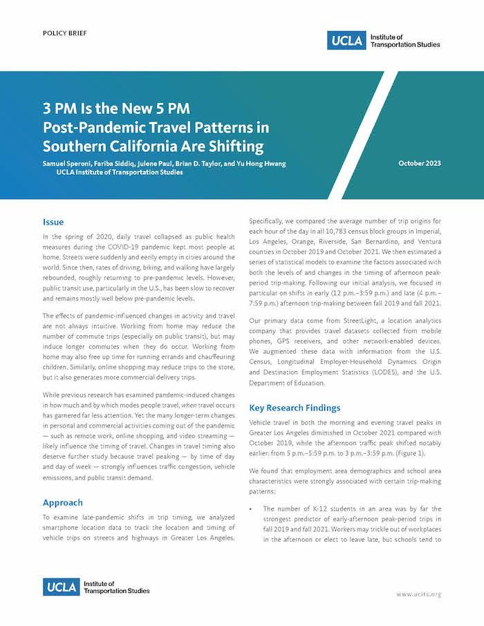To examine late-pandemic shifts in trip timing, this project analyzed smartphone location data to track the location and timing of vehicle trips on streets and highways in Greater Los Angeles. Specifically, this study compares the average number of trip origins for each hour of the day in all 10,783 census block groups in Imperial, Los Angeles, Orange, Riverside, San Bernardino, and Ventura counties in October 2019 and October 2021. The project then estimated a series of statistical models to examine the factors associated with both the levels of and changes in the timing of afternoon peak-period trip-making. Following an initial analysis, this project focused on shifts in early (12 p.m.–3:59 p.m.) and late (4 p.m.–7:59 p.m.) afternoon trip-making between fall 2019 and fall 2021. The primary data comes from StreetLight, a location analytics company that provides travel datasets collected from mobile phones, GPS receivers, and other network-enabled devices. This data was augmented with information from the U.S. Census, Longitudinal Employer-Household Dynamics Origin and Destination Employment Statistics (LODES), and the U.S. Department of Education.
