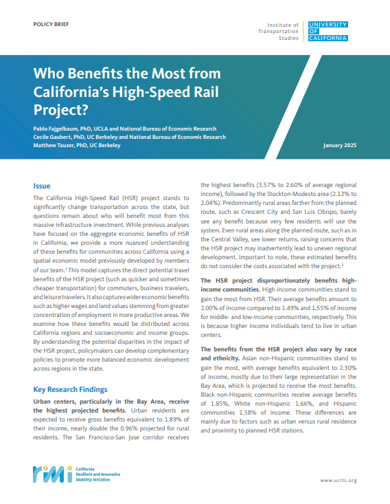 Transportation infrastructure projects — including the California High-Speed Rail project — often spark public debates that stem from a mix of economic and ideological factors. On the economic side, transportation investments tend to benefit some regions or groups while neglecting or negatively impacting others. Ideologically and politically, public views and policymaker decisions are shaped by preferences for collective goods, environmental concerns, and/or political affiliations.
