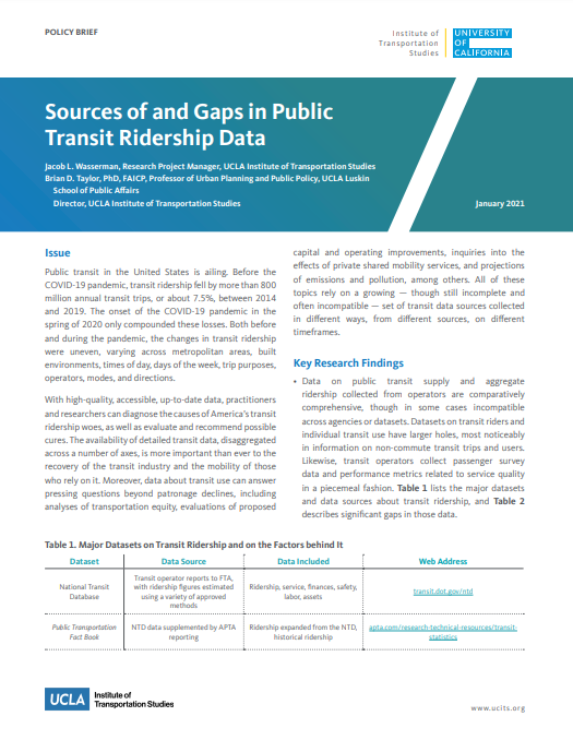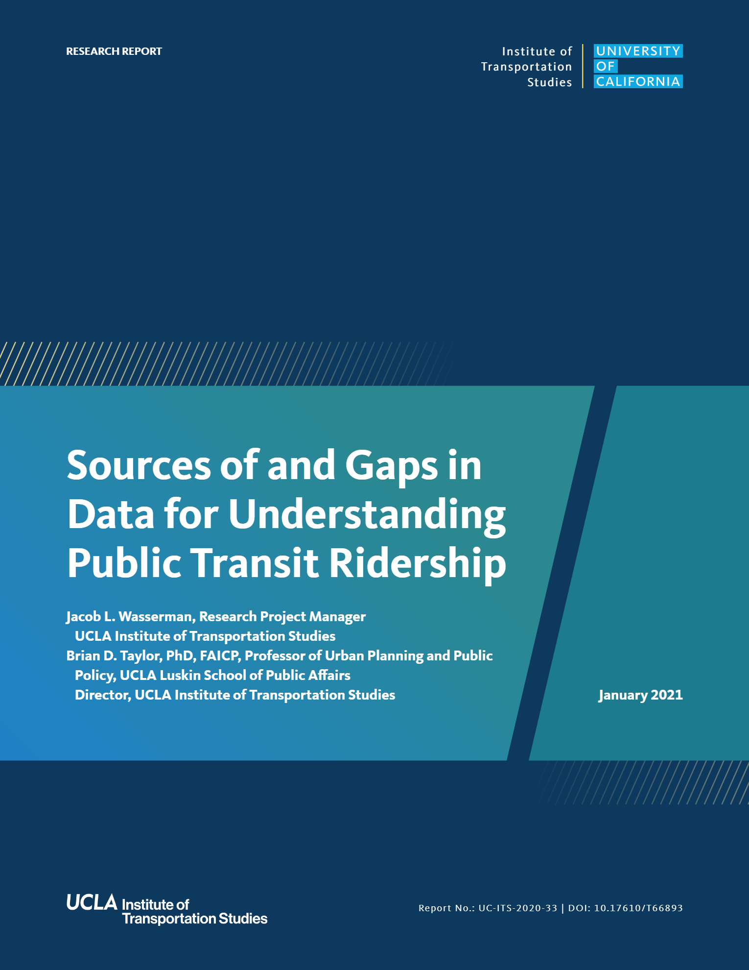 This project presents and reviews the available sources of data on public transit riders and ridership, as a resource for those who manage or simply wish to understand U.S. transit. In conducting this review, the researchers consider the advantages and disadvantages of publicly available data on transit from a variety of public and private sources, as well the relatively scarcer and less available sources of data on other providers of shared mobility, like ride-hail services, that compete with and complement public transit and pieces missing from the transit analytics pie. Data gaps both align with existing inequities and enable them to continue, unmeasured, as the COVID-19 pandemic has made closing these gaps all the more important.