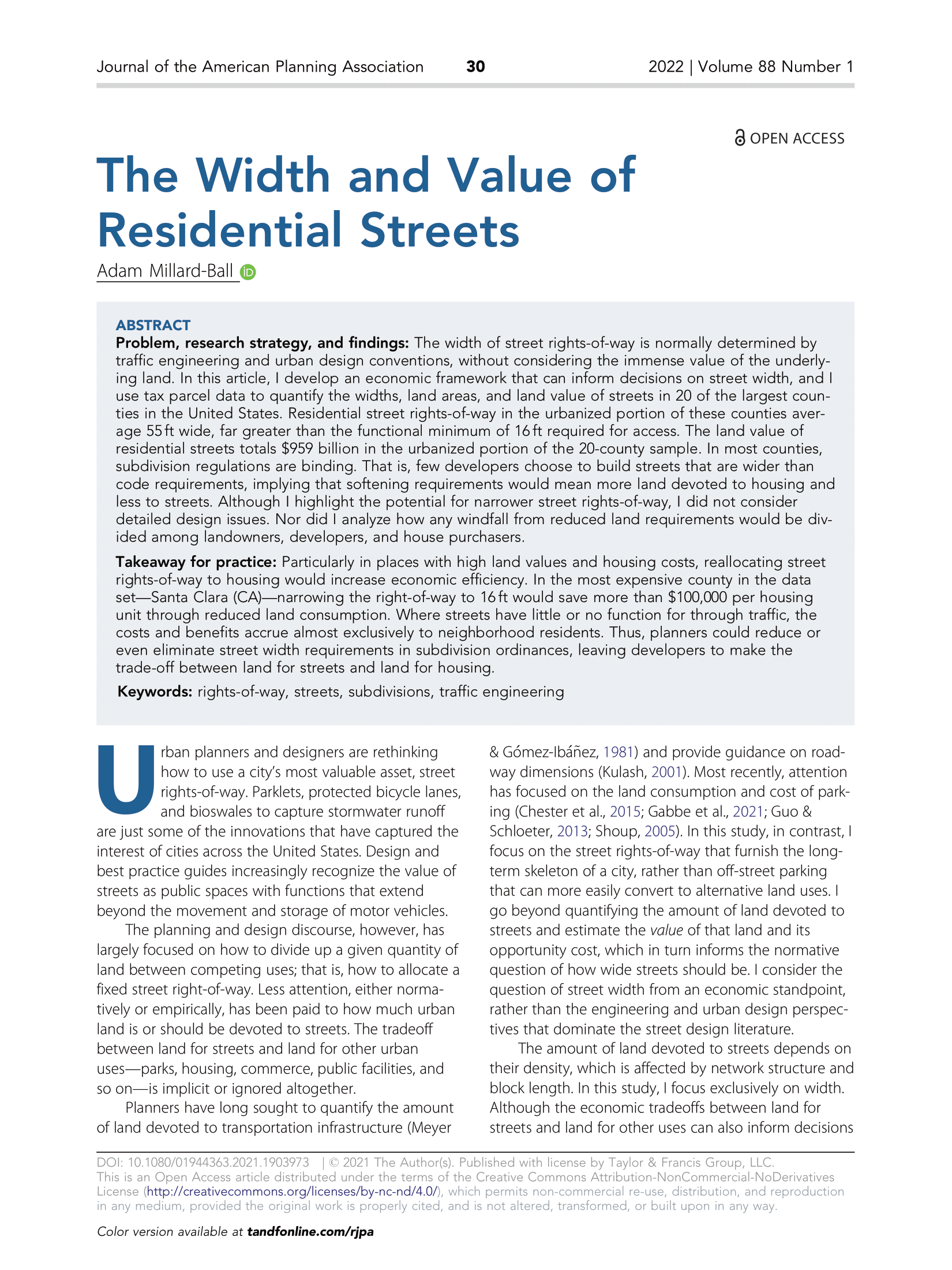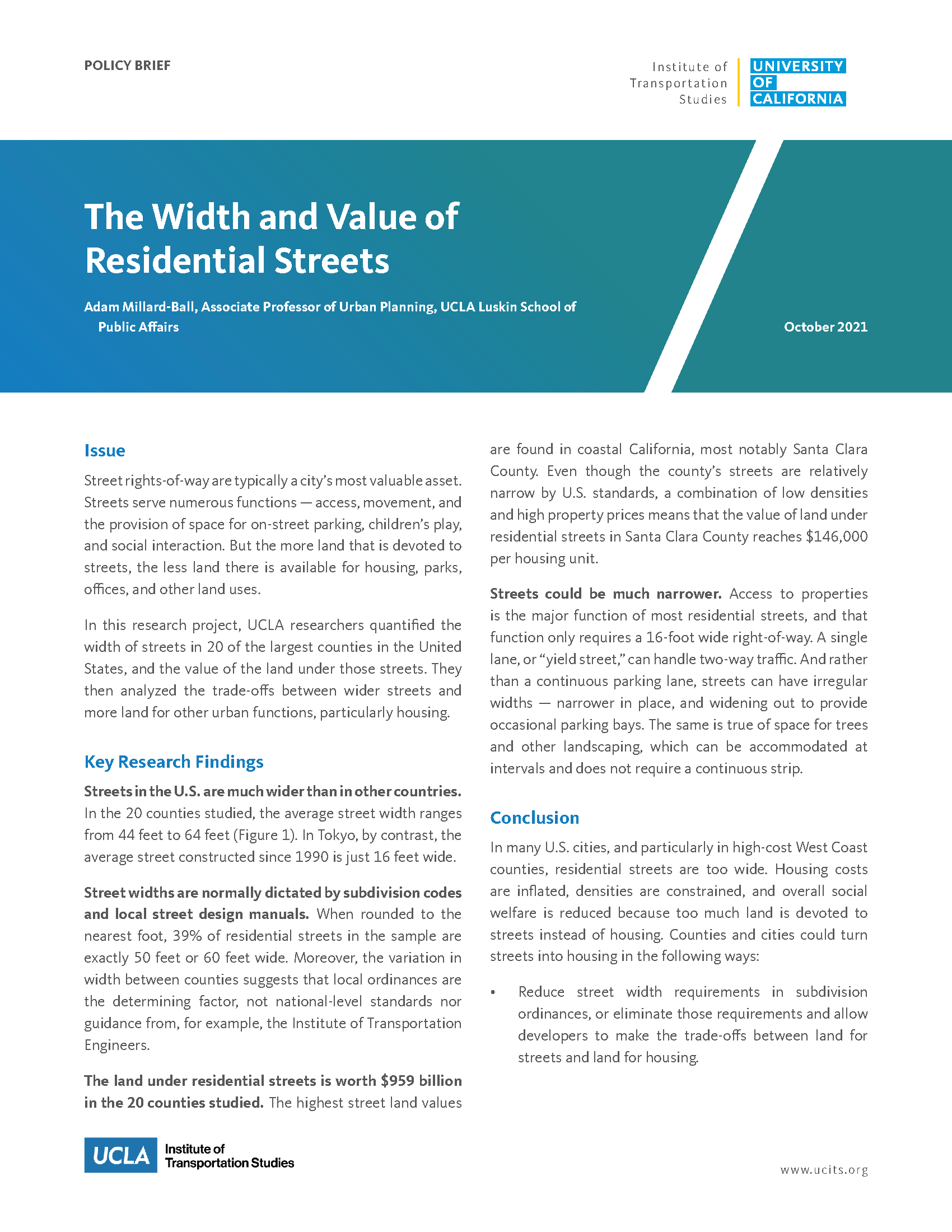 Street rights-of-way are typically a city’s most valuable asset. Streets serve numerous functions — access, movement, and the provision of space for on-street parking, children’s play, and social interaction. But the more land that is devoted to streets, the less land there is available for housing, parks, offices, and other land uses. In this research project, UCLA researchers quantified the width of streets in 20 of the largest counties in the United States, and the value of the land under those streets. This research found that streets in the U.S. are much wider than in other countries. Street widths are normally dictated by subdivision codes and local street design manuals. The highest street land values are found in coastal California, and streets could be much narrower.