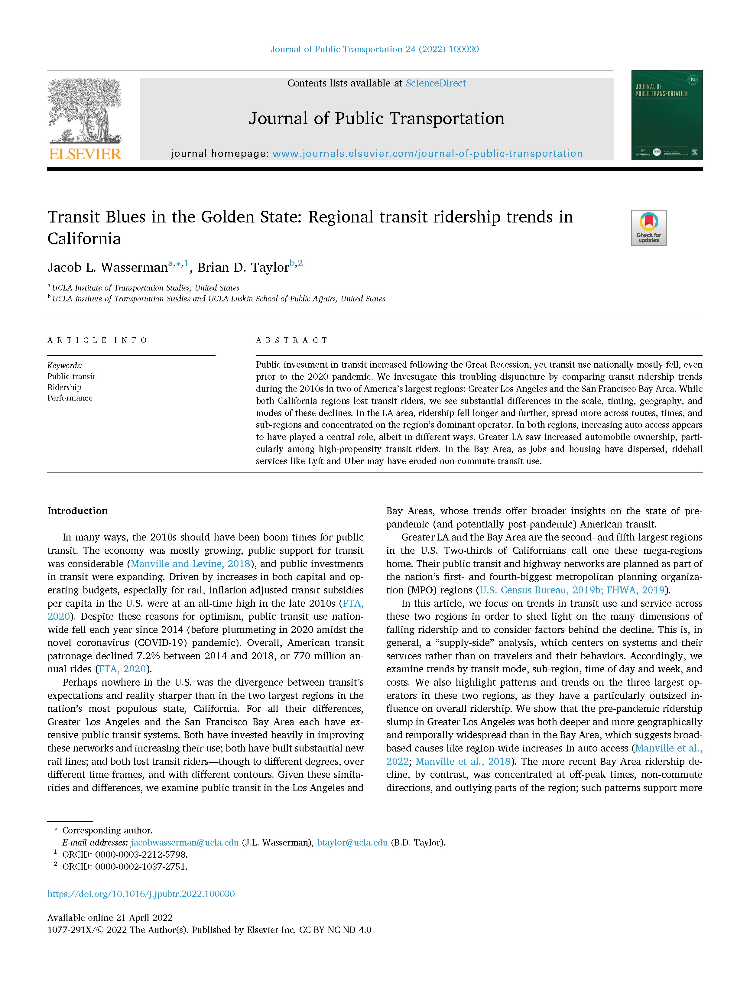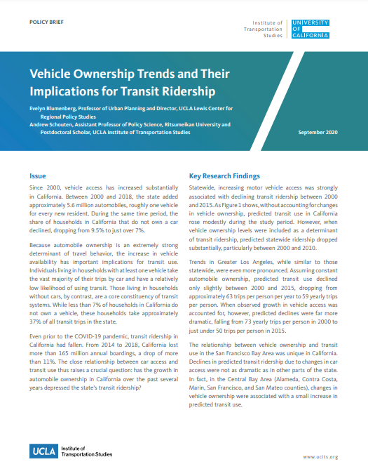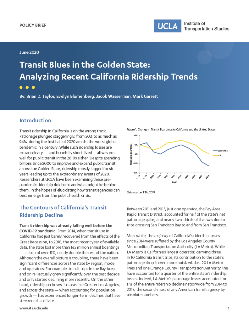 We find that ridership gains and losses have been asymmetric with respect to location, operators, modes, and transit users. Transit ridership has been on a longer-term decline in regions like Greater Los Angeles and on buses, while ridership losses in the Bay Area are more recent. While overall transit boardings across the state are down since 2014, worrisome underlying trends date back earlier as patronage failed to keep up with population growth. But reduced transit service is not responsible for ridership losses, as falling transit ridership occurred at the same time as operators instead increased their levels of transit service.