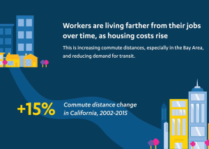 What factors help to explain losses in transit ridership? Increased access to automobiles explains much, if not most, of declining transit use. Private vehicle access has increased significantly in California and, outside of the Bay Area, is likely the biggest single cause of falling transit ridership. Additionally, new ride-hail services such as Lyft and Uber allow travelers to purchase automobility one trip at a time and likely serve as a substitute for at least some transit trips. Finally, neighborhoods are changing in ways that do not bode well for public transit. Households are increasingly locating in outlying areas where they experience longer commutes and less transit access to employment. At the same time, a smaller share of high-propensity transit users now live in the state’s most transit-friendly neighborhoods.