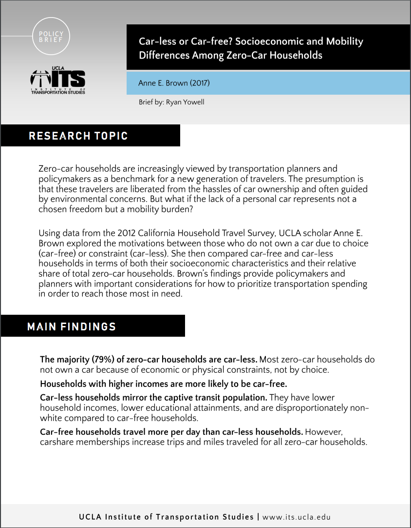 Zero-car households are increasingly viewed by transportation planners and policymakers as a benchmark for a new generation of travelers. The presumption is that these travelers are liberated from the hassle of car ownership and often guided by environmental concerns. But what if the lack of a personal car represents not a chosen freedom but a mobility burden? Using data from the 2012 California Household Travel Survey, this research explored the motivations between those who do not own a car due to choice (car-free) or constraint (car-less). It was found that the majority (79%) of zero-car households are car-less, and these households have similar conditions as the transit population.