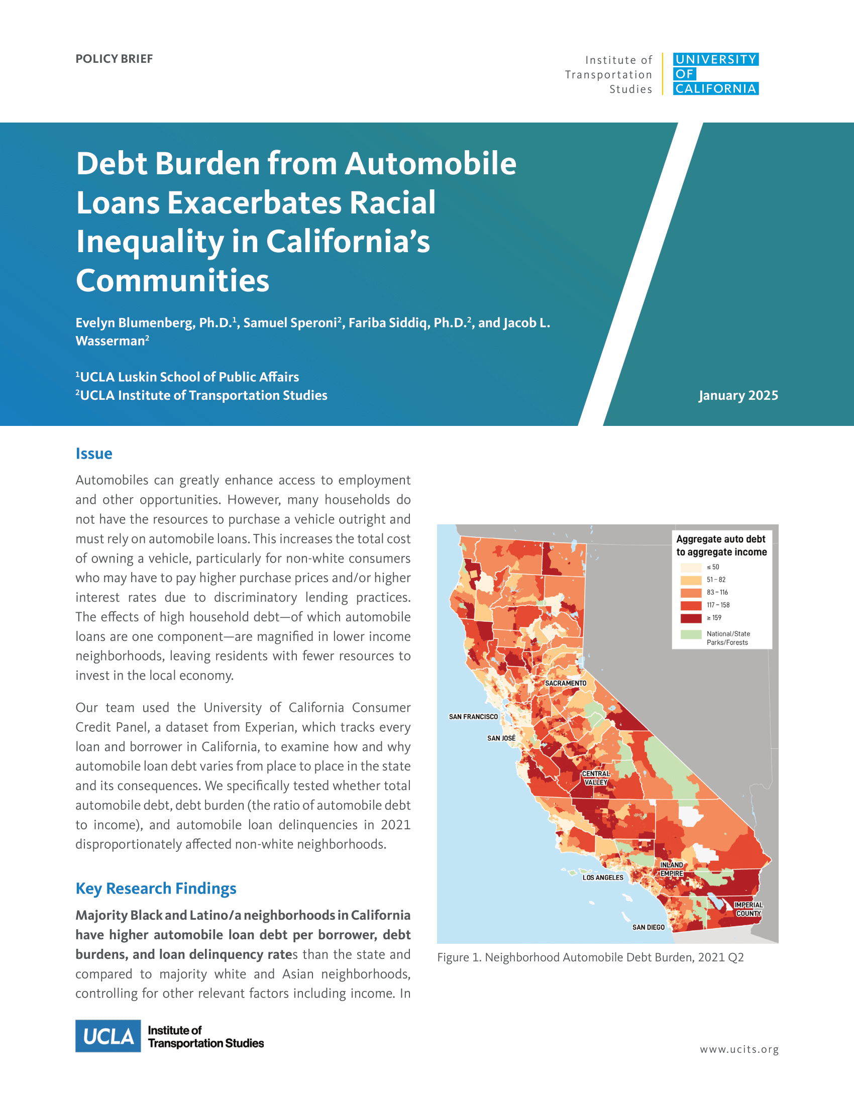Automobiles can greatly enhance access to employment and other opportunities. However, many households do not have the resources to purchase a vehicle outright and must rely on automobile loans. This increases the total cost of owning a vehicle, particularly for non-white consumers who may have to pay higher purchase prices and/or higher interest rates due to discriminatory lending practices. The effects of high household debt—of which automobile loans are one component—are magnified in lower income neighborhoods, leaving residents with fewer resources to invest in the local economy. Our team used the University of California Consumer Credit Panel, a dataset from Experian, which tracks every loan and borrower in California, to examine how and why automobile loan debt varies from place to place in the state and its consequences. We specifically tested whether total automobile debt, debt burden (the ratio of automobile debt to income), and automobile loan delinquencies in 2021 disproportionately affected non-white neighborhoods.
