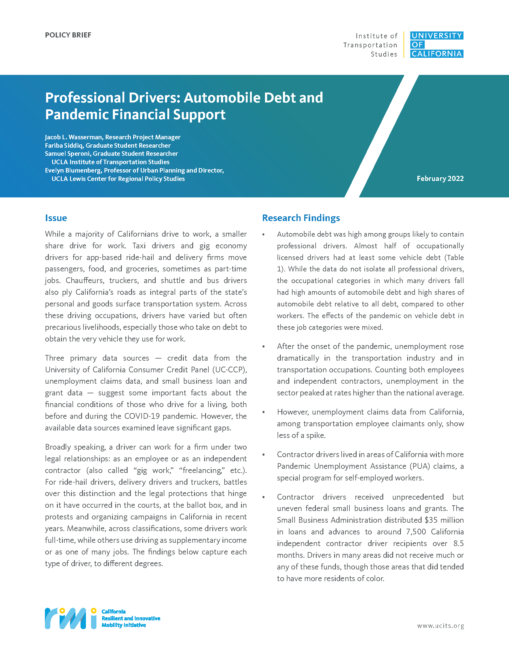 While a majority of Californians drive to work, a smaller share drive for work. Taxi drivers and gig economy drivers for app-based ride-hail and delivery firms move passengers, food, and groceries, sometimes as part-time jobs. Chauffeurs, truckers, and shuttle and bus drivers also ply California’s roads as integral parts of the state’s personal and goods surface transportation system. Across these driving occupations, drivers have varied but often precarious livelihoods, especially those who take on debt to obtain the very vehicle they use for work.