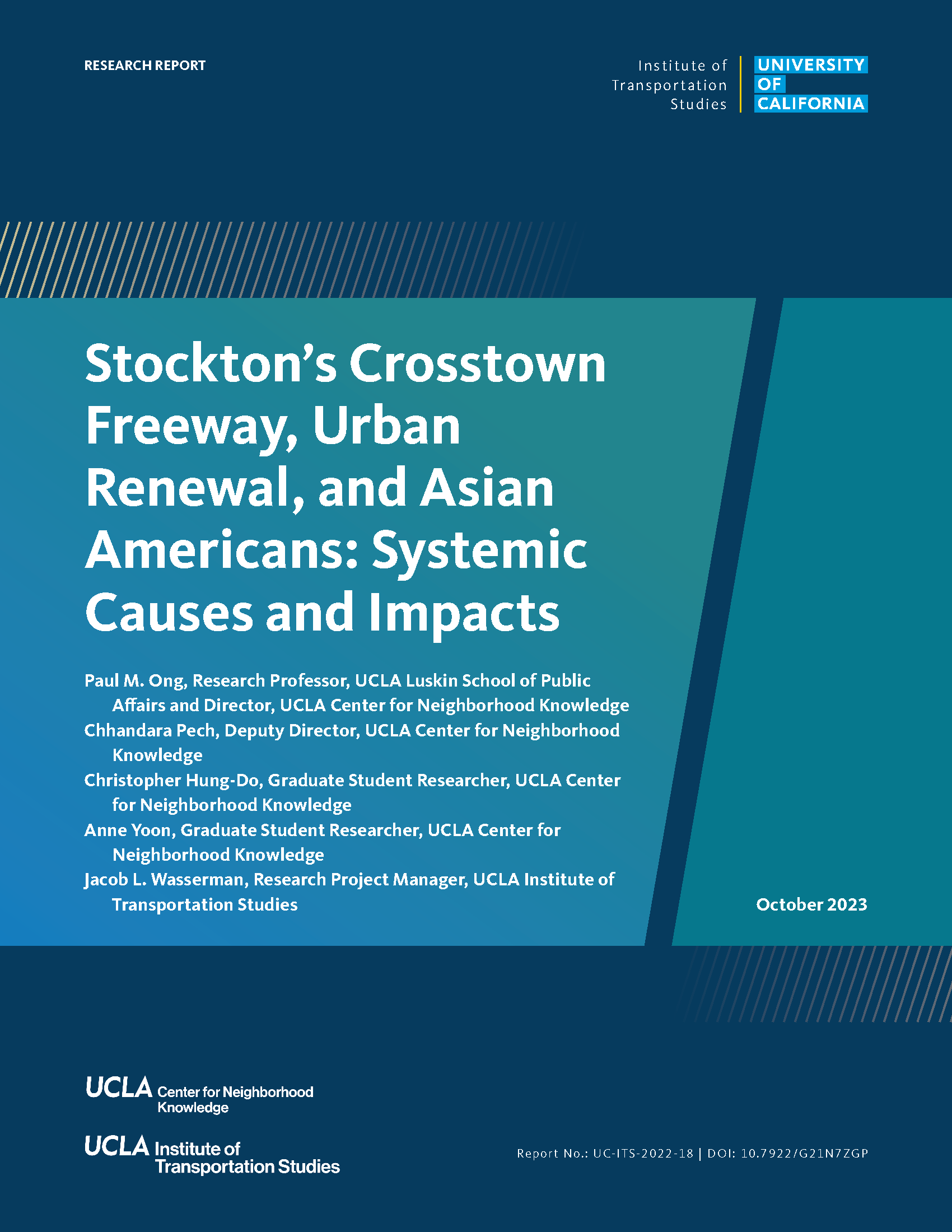 This project uses mixed methods to examine the systemic causes and consequences of the construction of Stockton, California’s Crosstown Freeway and of urban redevelopment for Asian Americans communities. Stockton underwent spatial restructuring in the decades after the Second World War, and state and local government contributed and responded to these changes by implementing connected freeway and urban renewal programs. Historical and contemporaneous xenophobia and racism placed Chinatown, Japantown, and Little Manila in their path, with these enclaves deemed blighted and subject to “slum clearance.” The choice of freeway route was racially biased. The neighborhood surrounding an unchosen route was predominantly white, whereas that of the chosen route was predominantly home to people of color. Freeway construction during the 1960s and 1970s directly displaced hundreds of people and housing units downtown— mainly people of color, particularly Asians. The communities most harmed were the Asian American enclaves, where the housing stock declined by about three quarters between 1960 and 1970. The losses were not only physical, as the freeway and redevelopment eviscerated once vibrant ethnic commercial hubs. Because of long-standing economic and political marginalization, Asian Americans were relatively powerless to prevent the destruction; nonetheless, they fought to build affordable housing for their people, protect and in some cases relocate cultural institutions, and support surviving ethnic businesses. In the long run, Stockton failed to revitalize its downtown, while destroying its cultural diversity. The findings can help reform and improve professional practice within the transportation arena to ensure racial fairness and equity.