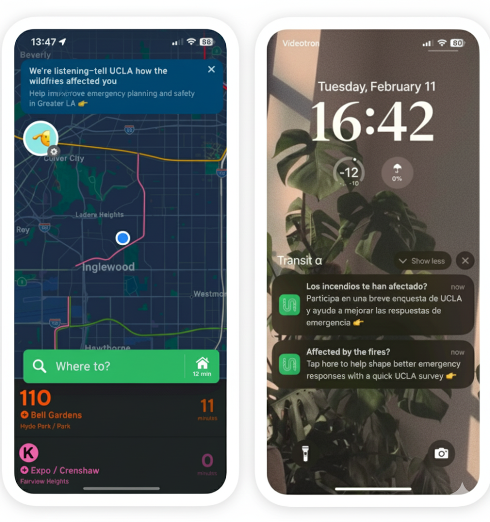 From Feb. 3–12, 2025, the survey was advertised via an in-app banner (Figure 1), displayed in English and Spanish to anyone using the app in Los Angeles County. On Feb. 11, a push notification was also sent to users who had actively engaged with the app but had not clicked the banner. Over the nine-day period, we received 623 complete responses, including 26% (n=164) from people who evacuated.