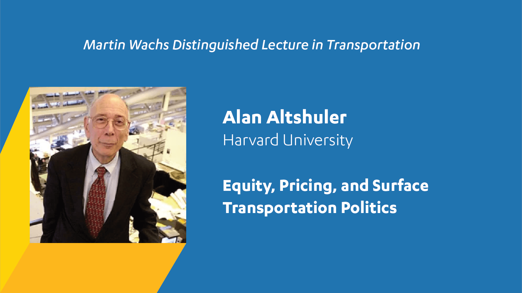 The 4th annual Martin Wachs Distinguished Lecture by Alan Altshuler, professor of urban policy and planning in the Kennedy School of Government and the Graduate School of Design at Harvard, examined the new debates about funding for surface transportation, and posed to the audience the question of how managing road congestion will occur in an era when major capacity expansion is rarely feasible. He described how these debates are also routinely framed around conceptions of equity and sought to explain the distinctive nature of equity debates in U.S surface transportation, with particular attention to congestion pricing and High Occupancy Toll Lanes.